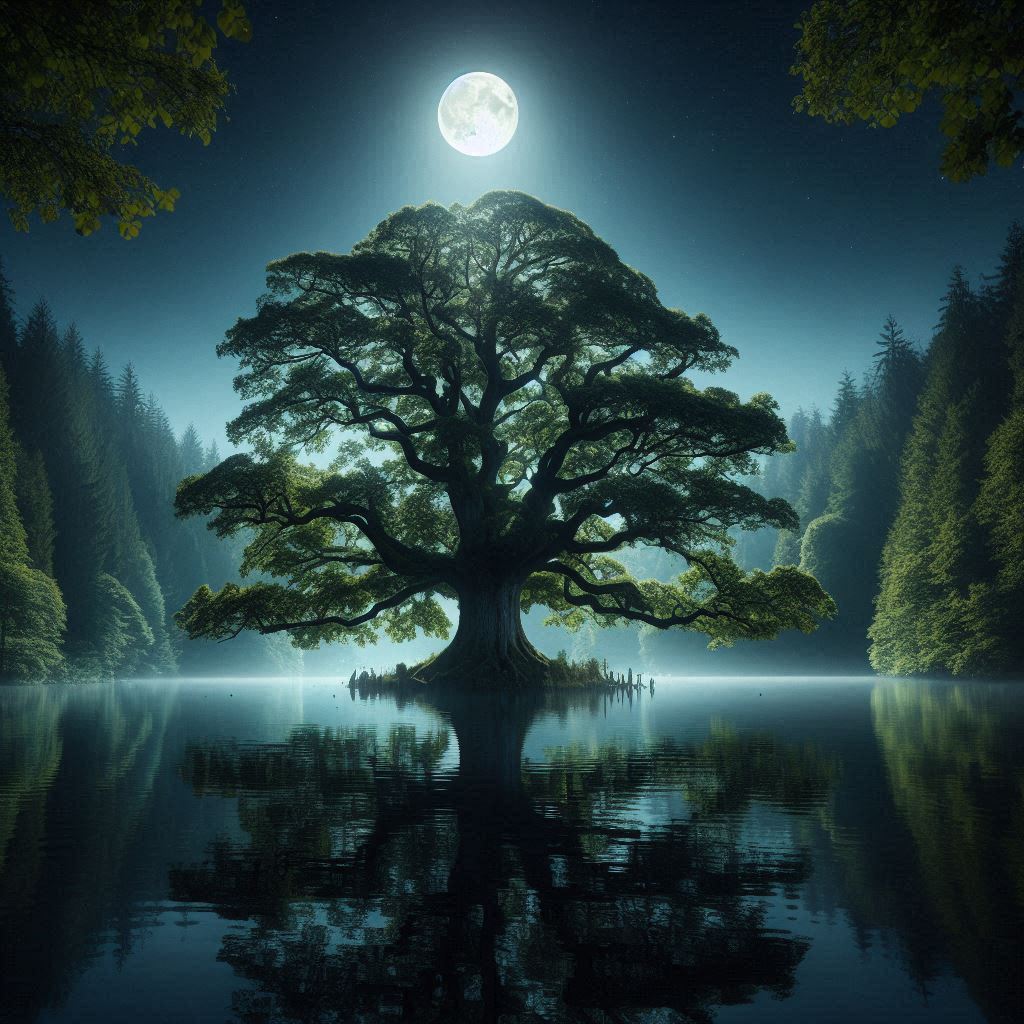 liste des chapitresLes arbres rangés de manière irrégulière s’ouvraient sur une petite étendue d’eau où se reflétait une pleine lune lumineuse éclairant le reste du paysage de son seul halo brillant. Cette vue magnifique était encore embellie par les énormes racines qui perçaient le sol boueux par endroits, les minces parcelles d’herbe fraîche qui sentaient la nature en pleine possession de ses droits, et les rares fleurs résistantes au froid sur lesquelles perlait l’humidité en petites gouttes d’eau. Au centre de toutes ces belles choses, au centre de l’étendue d’eau sur une parcelle de terre encore émergente, se dressait un arbre majestueux, presque aussi vieux que le monde. Il trônait là en maître absolu avec de nombreuses ramifications qui se terminaient par des branches plus fines et plus fragiles, et encore doté de tout son feuillage. Il avait quelque chose d’impérial cet arbre. La surface tranquille du lac dormait immobile dans un silence de plomb seulement dérangé par les petits bruissements des feuilles et des herbes sauvages. Quelques lucioles voletaient ici et là au-dessus de l’eau et accentuaient l’éclairage de la lune haut dans le ciel bleu nuit.